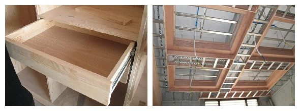 ● 抽屜高度120mm-140mm,木工板制作框架,碼釘固定。橫面木工板切面應(yīng)用膩?zhàn)由嫌?