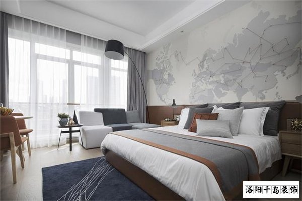 我真是沒有想到臥室能夠裝修的這么寬敞大氣,主要是格局劃分非常棒,樣板間在裝修的時候把陽臺與臥室打通,這樣使得空間進一步得到了擴展,另外在背景墻上采用高級灰色的格調,上面還有世界地圖的圖案,將臥室映襯的非常宏偉壯觀。