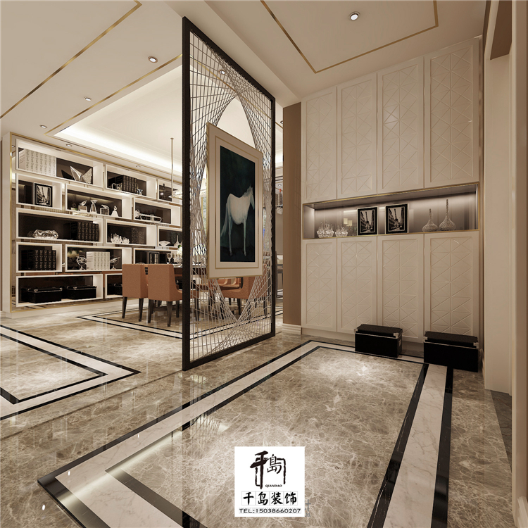 入戶玄關(guān)和餐廳之間的鏤空隔斷是整個空間的一大亮點(diǎn),非常的富有創(chuàng)意,白色的鞋柜也和整體風(fēng)格相呼應(yīng)。