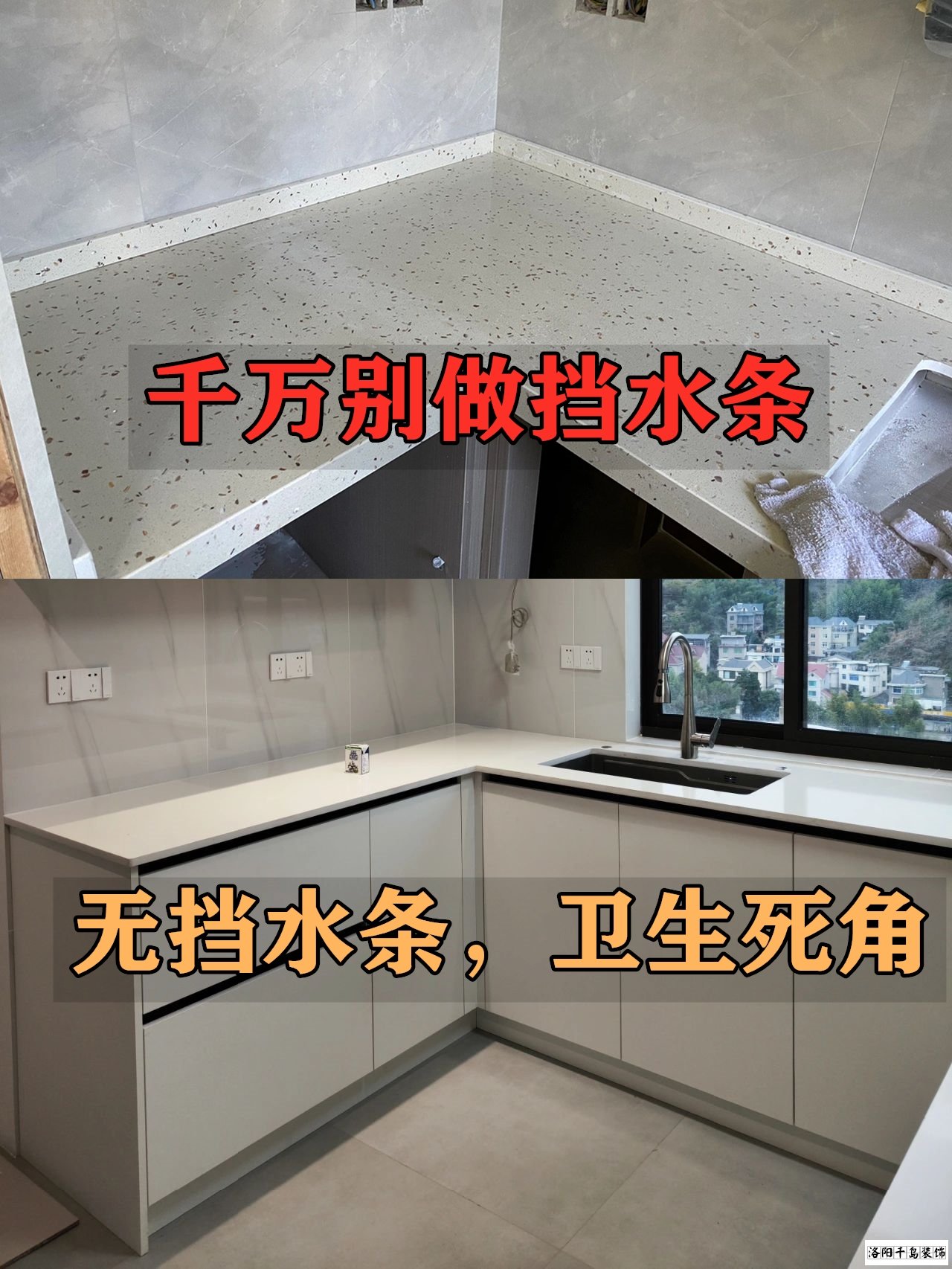 首先,臺(tái)面不要再做這種擋水條了,多兩到膠,時(shí)間久了肯定會(huì)受潮發(fā)黑的,根本清理不干凈。它的作用其實(shí)就是遮墻和柜子之間的縫隙,我們只要在瓦工階段囑咐好工人師傅把墻貼平,像這樣不做擋水條,衛(wèi)生死角少了不說(shuō),臺(tái)面又寬兩公分。