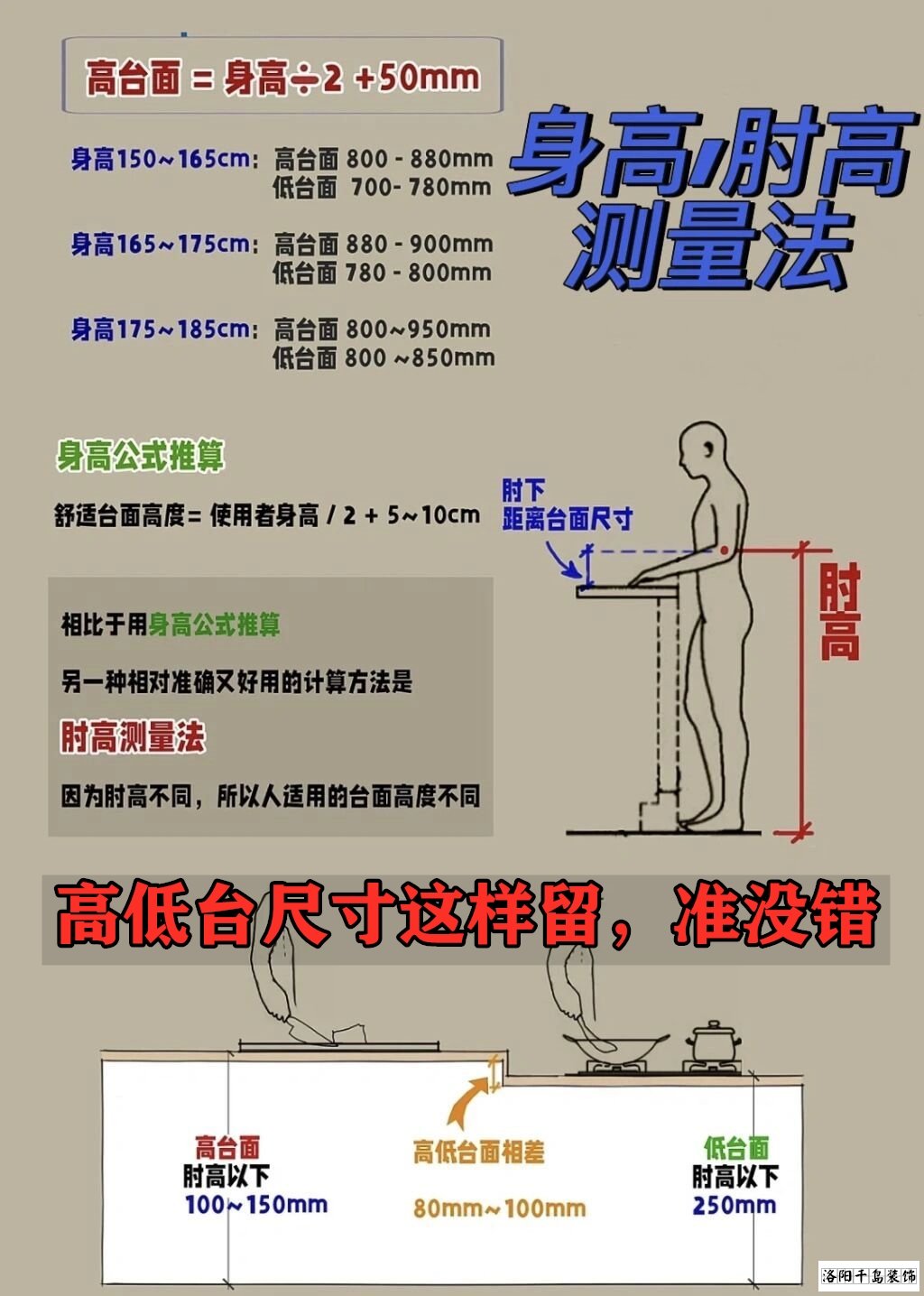 另外櫥柜要想好用,一定要做這種高低臺(tái)的,高度差呢,最好在八到十公分,這樣呢,炒菜我就不用抬胳膊了,切菜呢,洗菜我們不用彎腰,整個(gè)做飯都是舒服的,臺(tái)面具體的高度你就套上這個(gè)公式就行。